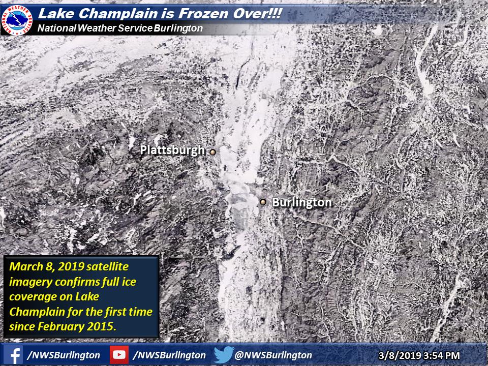 The National Weather Service in Burlington tweeted Saturday that the lake is completely frozen. The tweet included a satellite photo dated Friday that shows full ice coverage on Lake Champlain.